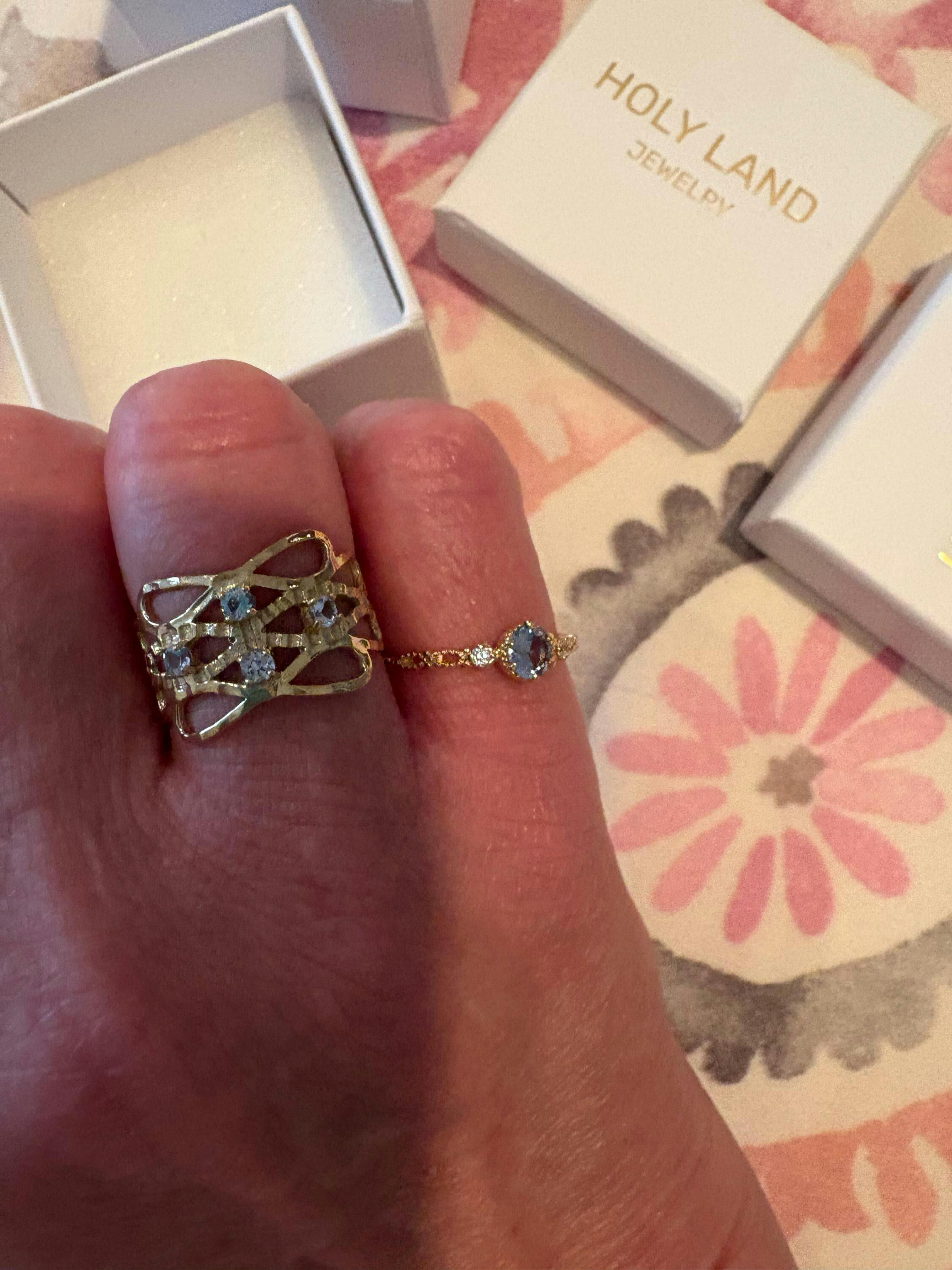 Embrace the charm of artisanal craftsmanship with our hammered ring featuring four exquisite round aquamarine gemstones. The textured surface adds a touch of rugged sophistication, beautifully contrasting with the vibrant allure of the aquamarine stones. Each stone, carefully set within the hammered frame, creates a harmonious blend of contemporary style and natural elegance. This ring is a testament to individuality and craftsmanship, making it a unique addition to any jewelry collection. Elevate your look with this distinctive piece that marries the artistry of handcrafted design with the timeless beauty of aquamarine. Explore our collection now and make a statement with this chic and unique hammered ring.