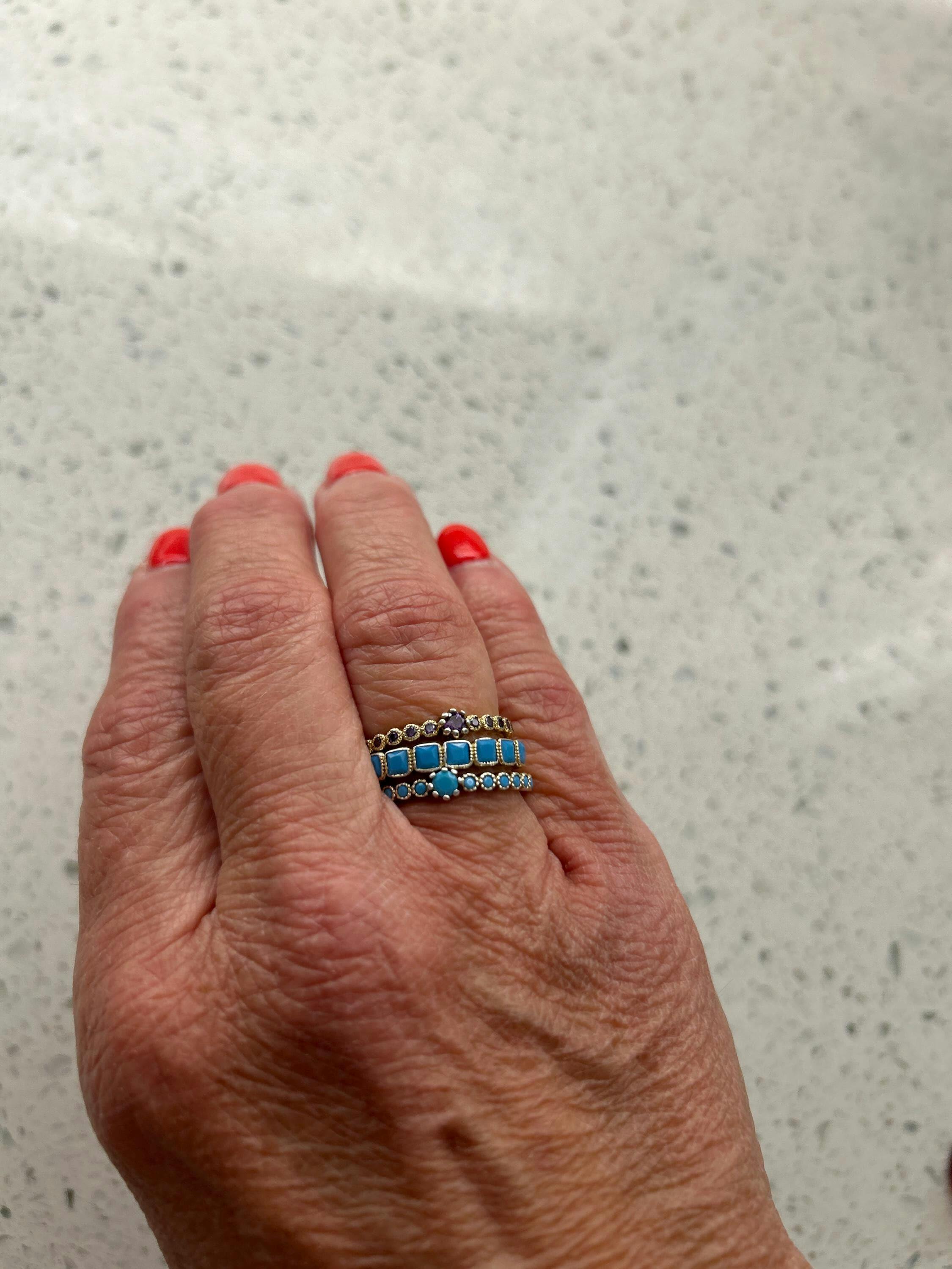 Embrace the subtle allure of our delicate stacking ring, featuring a 3mm round amethyst as the main stone, delicately set amidst a band adorned with twelve small amethyst stones. This charming piece exudes sophistication with a touch of whimsy, making it the perfect addition to your stack or a standalone statement. Meticulously crafted for comfort and style, this ring captures the essence of understated elegance. Explore our collection now and discover the enchanting beauty of this delicate stacking ring, designed to add a whisper of elegance to your everyday ensemble.