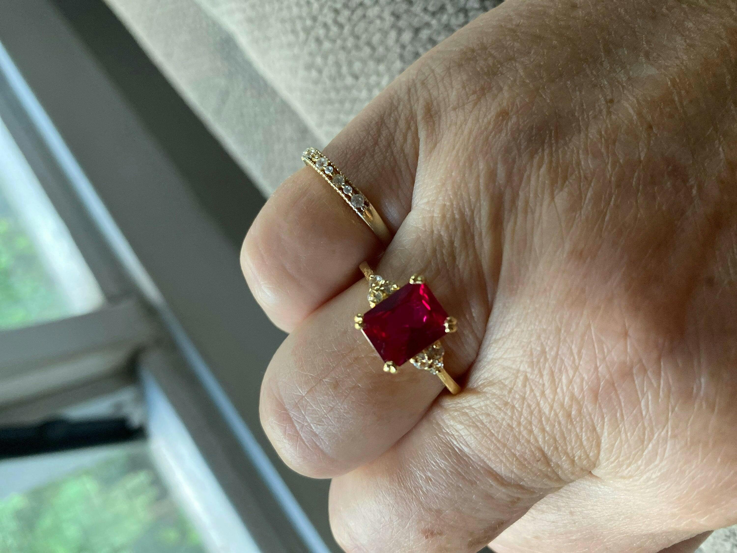 Celebrate the intensity of your love with our statement engagement ring featuring an octagon ruby as the main gemstone. Renowned for its fiery hue and timeless allure, the ruby symbolizes passion, vitality, and everlasting commitment. Flanked by three small clear quartz stones on each side, this ring exudes elegance and sophistication. The clear quartz stones add a touch of brilliance, enhancing the luminosity of the central ruby and accentuating its vibrant color. Crafted with meticulous attention to detail and designed to symbolize the depth of your love, this statement engagement ring is a radiant expression of your devotion. Embark on your journey together with this stunning piece that captures the essence of your eternal bond. Explore our collection now and discover a ring that embodies the allure of nature's colors - a piece that radiates with every gesture of grace.