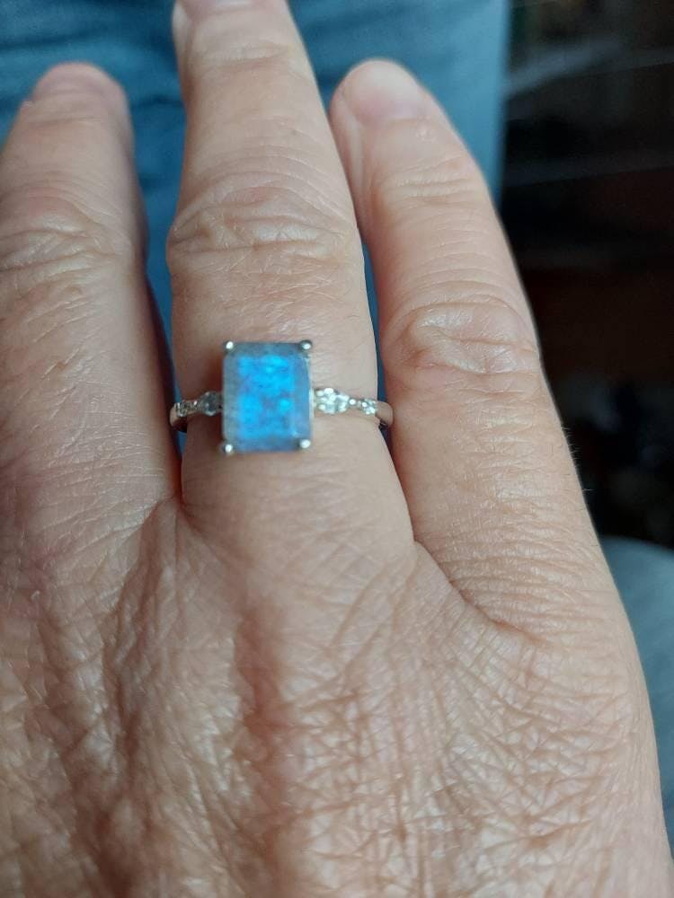 An engagement ring featuring an octagon labradorite as the main gemstone offers a mesmerizing display of iridescence and mystique. The enchanting play-of-color within the labradorite, with its hues of blue, green, and gold, symbolizes transformation, intuition, and protection, making it an intriguing choice for a statement piece. Flanking the octagon labradorite are two small clear quartz stones on each side, adding a delicate shimmer and accentuating the luminosity of the central gemstone. Clear quartz, renowned for its cleansing and amplifying properties, enhances the ethereal beauty of the labradorite, creating a harmonious and balanced composition. This extraordinary combination of gemstones captures the essence of magic and mystery, making it a cherished symbol of a profound and enduring bond. Explore our collection now and let the labradorite engagement ring be the embodiment of your everlasting love story.