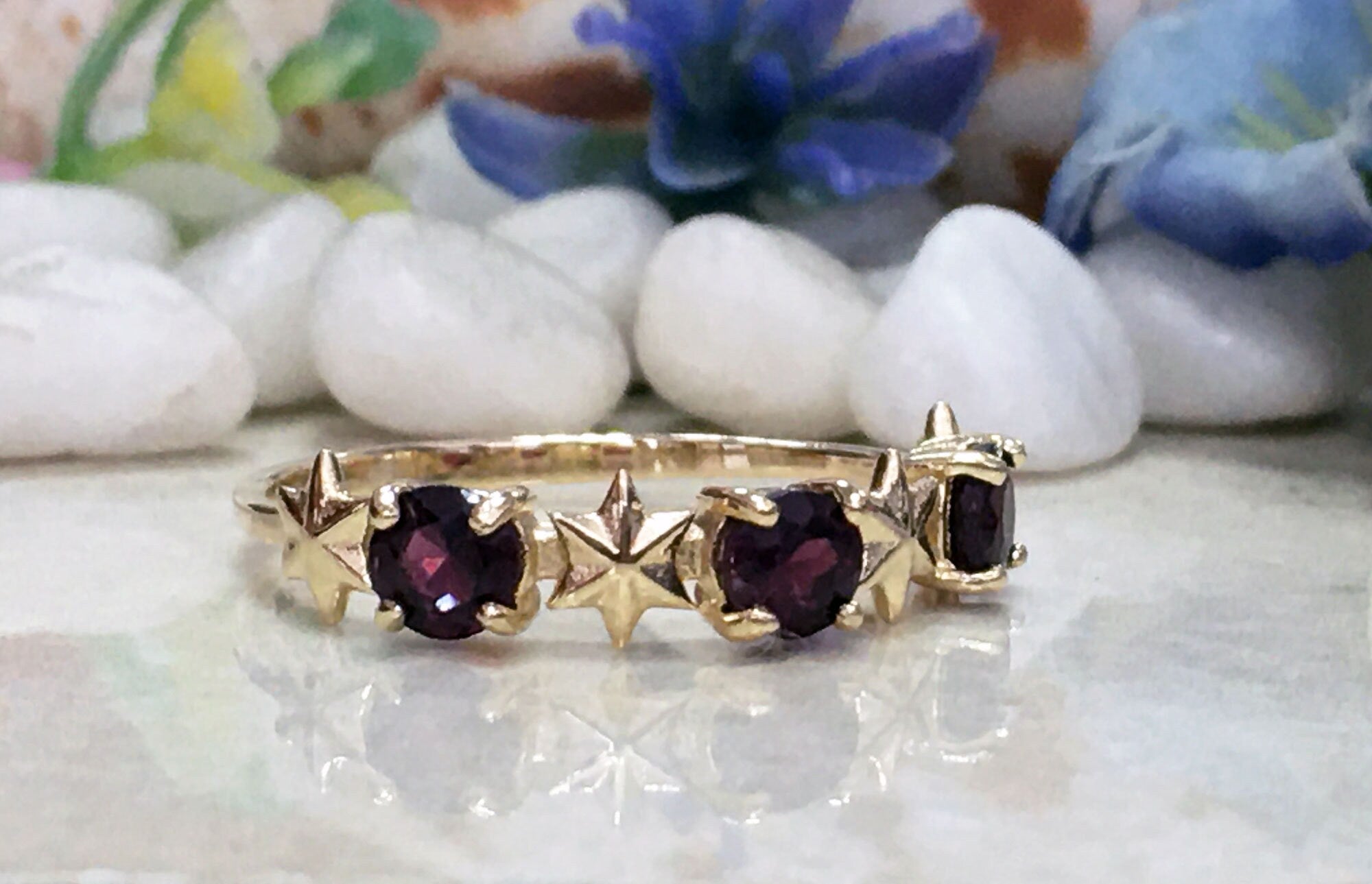 Red Garnet Ring - January Birthstone - Delicate Ring with Three Red Garnet Gemstones and Star Accents - H.L.Jewelry