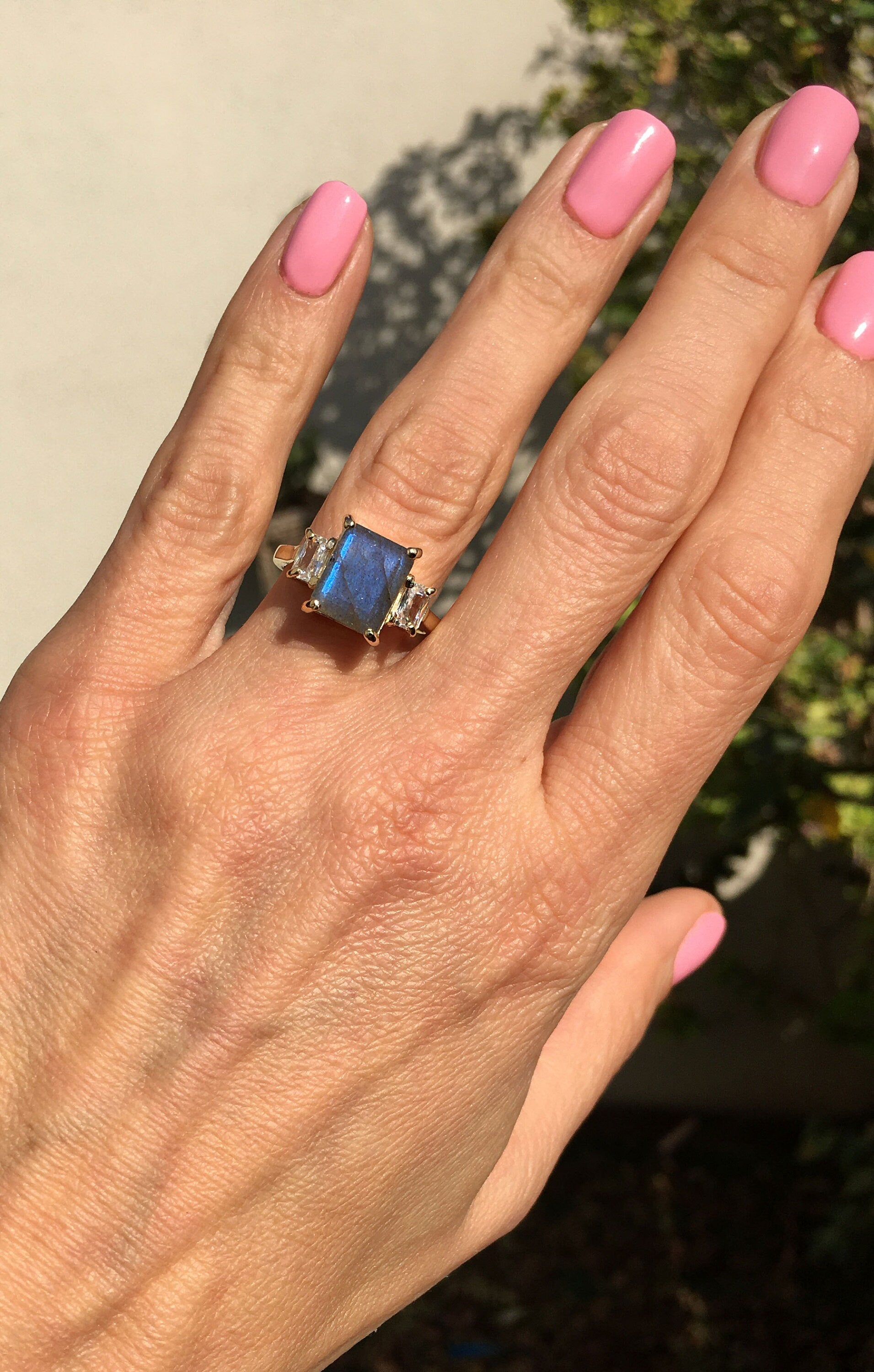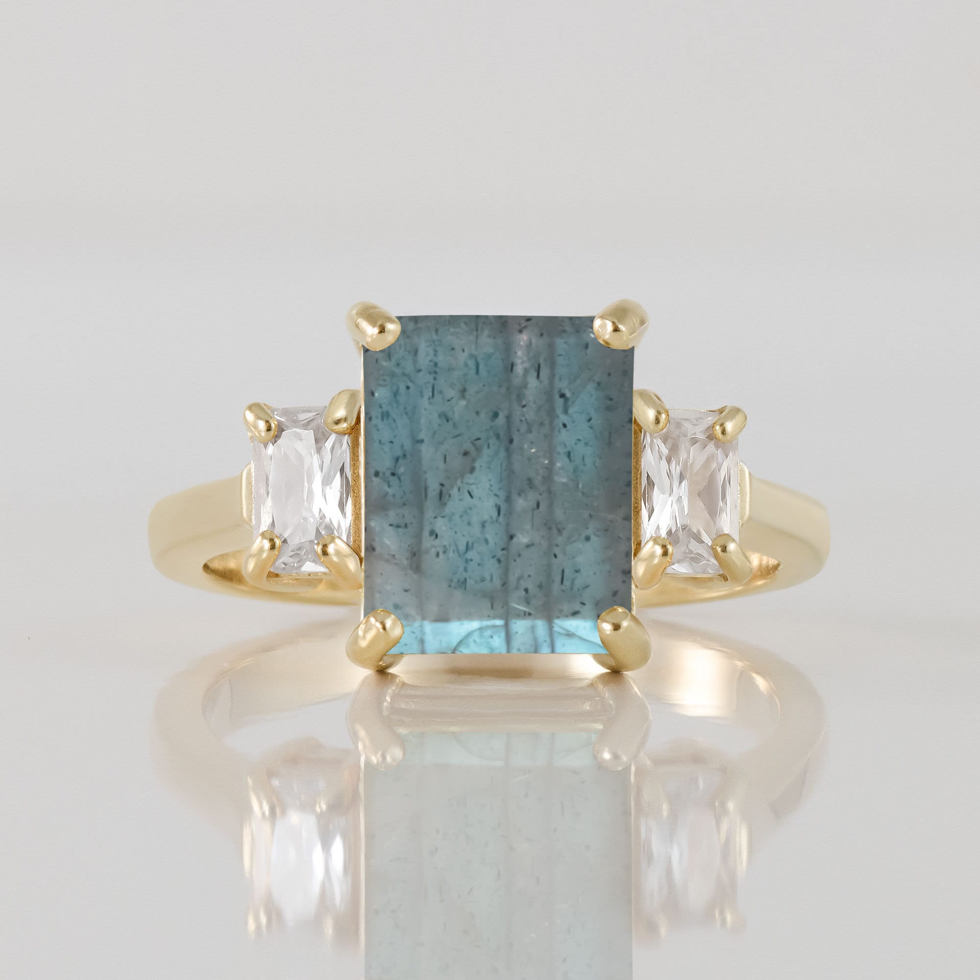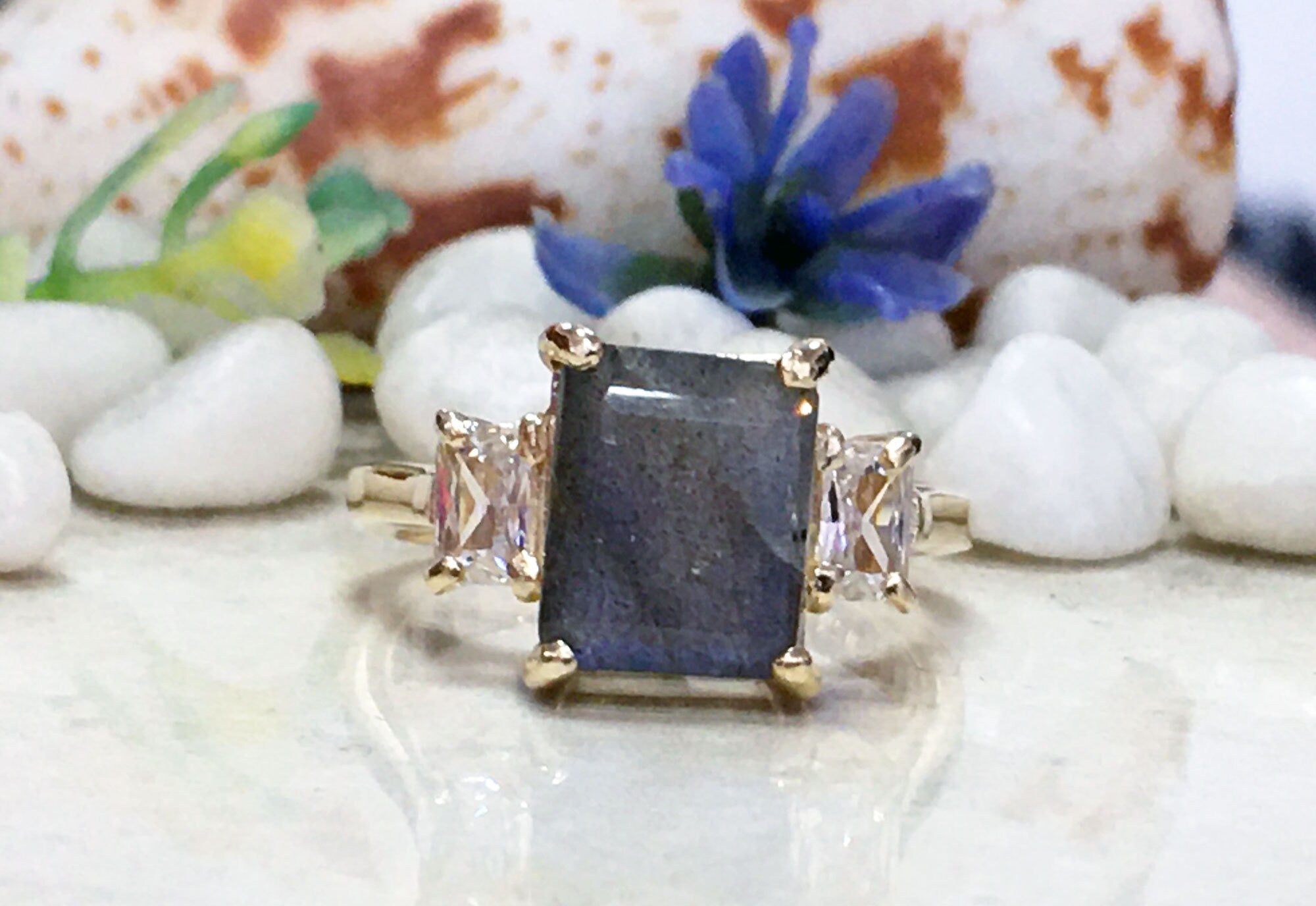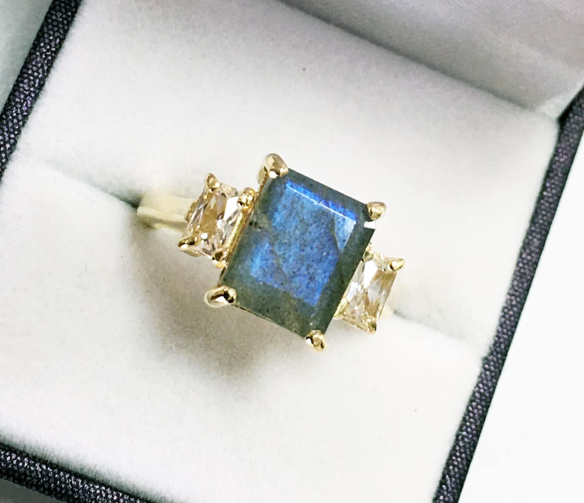 An engagement ring featuring an octagon labradorite as the main gemstone offers a mesmerizing display of iridescence and mystique. The enchanting play-of-color within the labradorite, with its hues of blue, green, and gold, symbolizes transformation, intuition, and protection, making it an intriguing choice for a statement piece. Flanking the octagon labradorite are small clear quartz stone on each side, adding a delicate shimmer and accentuating the luminosity of the central gemstone. Clear quartz, renowned for its cleansing and amplifying properties, enhances the ethereal beauty of the labradorite, creating a harmonious and balanced composition. This extraordinary combination of gemstones captures the essence of magic and mystery, making it a cherished symbol of a profound and enduring bond. Explore our collection now and let the labradorite engagement ring be the embodiment of your everlasting love story.