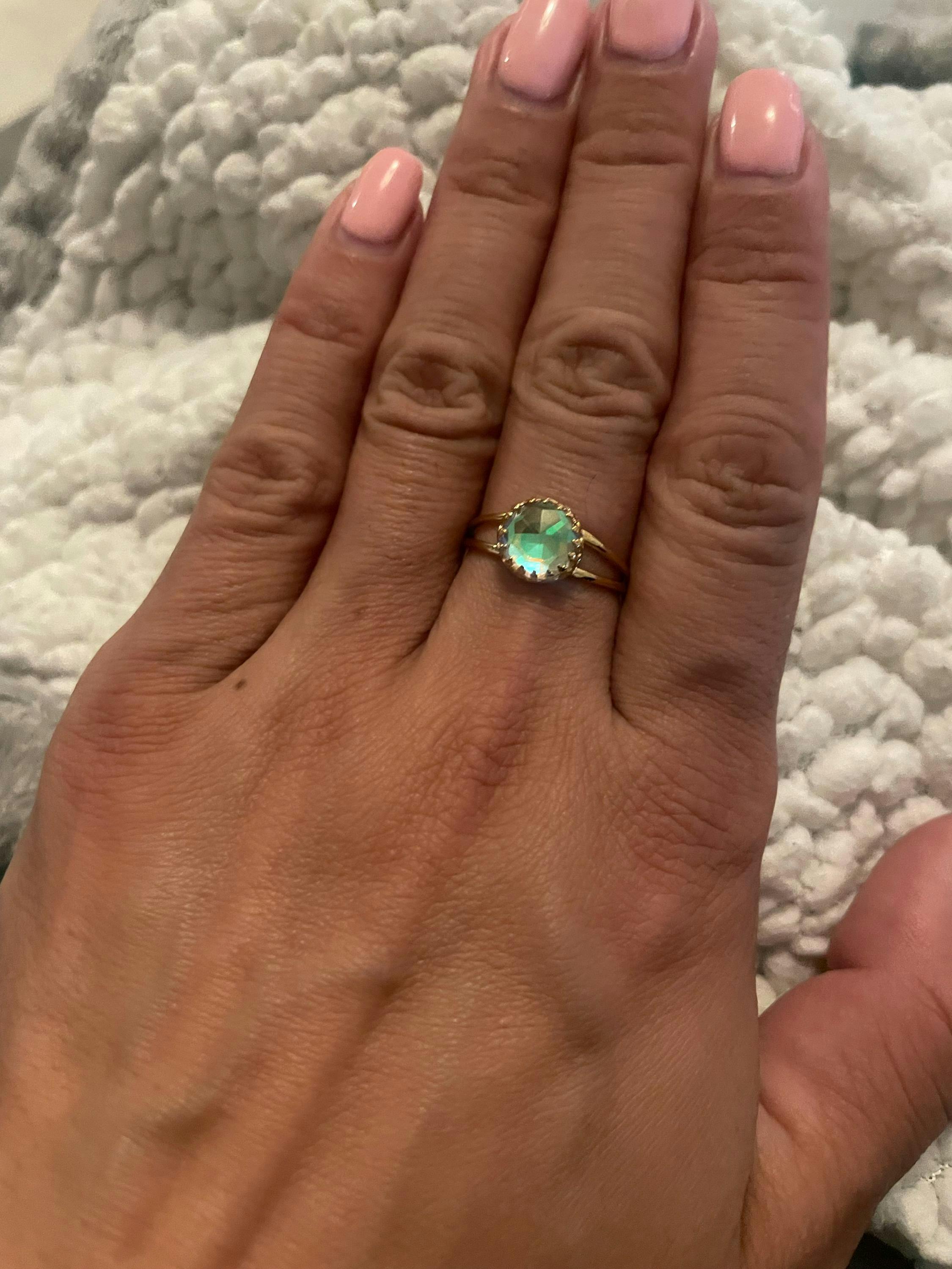 Very beautiful ring!! I love it!! The mystic fire topaz is such an unusual stone. Glad I ordered it, it is very comfortable on my finger. Thank you so much for such a lovely piece of jewelry!