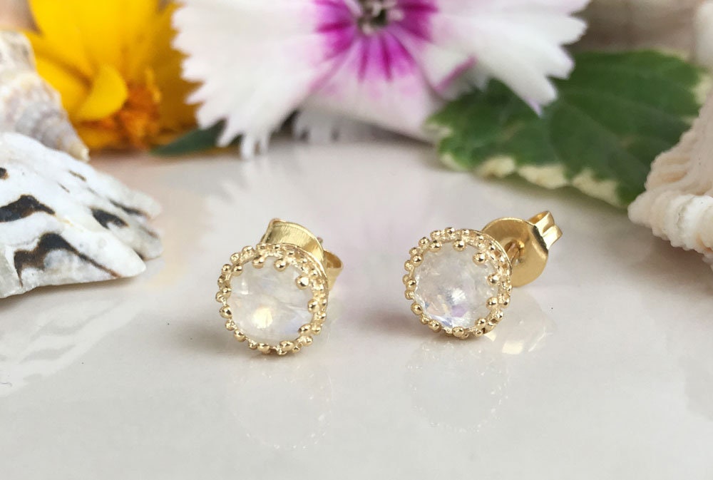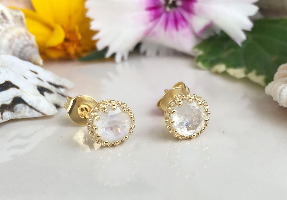 Understated Glamour: Small Round Stud Earrings with Rainbow Moonstone