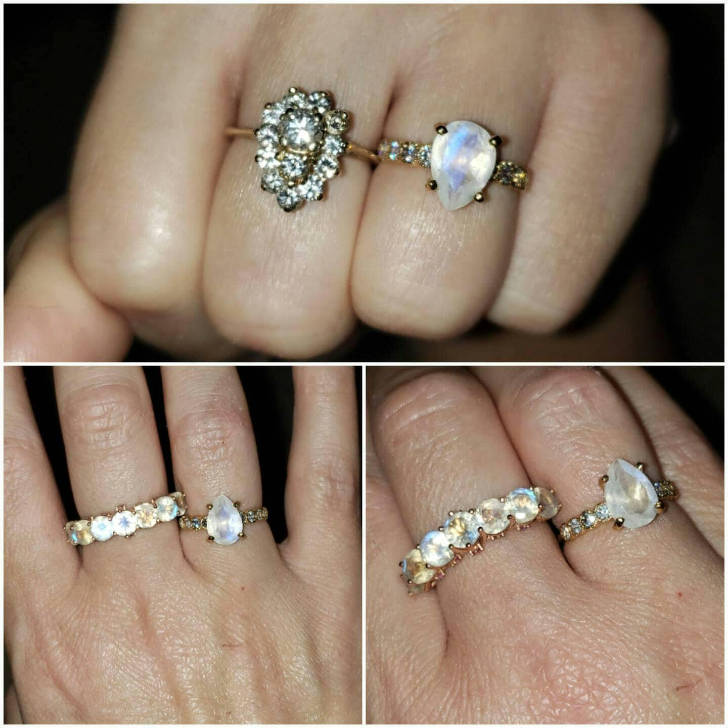 Rainbow Moonstone Ring - June Birthstone - Pear-Shaped Rainbow Moonstone Statement Engagement Ring with Clear Quartz Accents - H.L.Jewelry