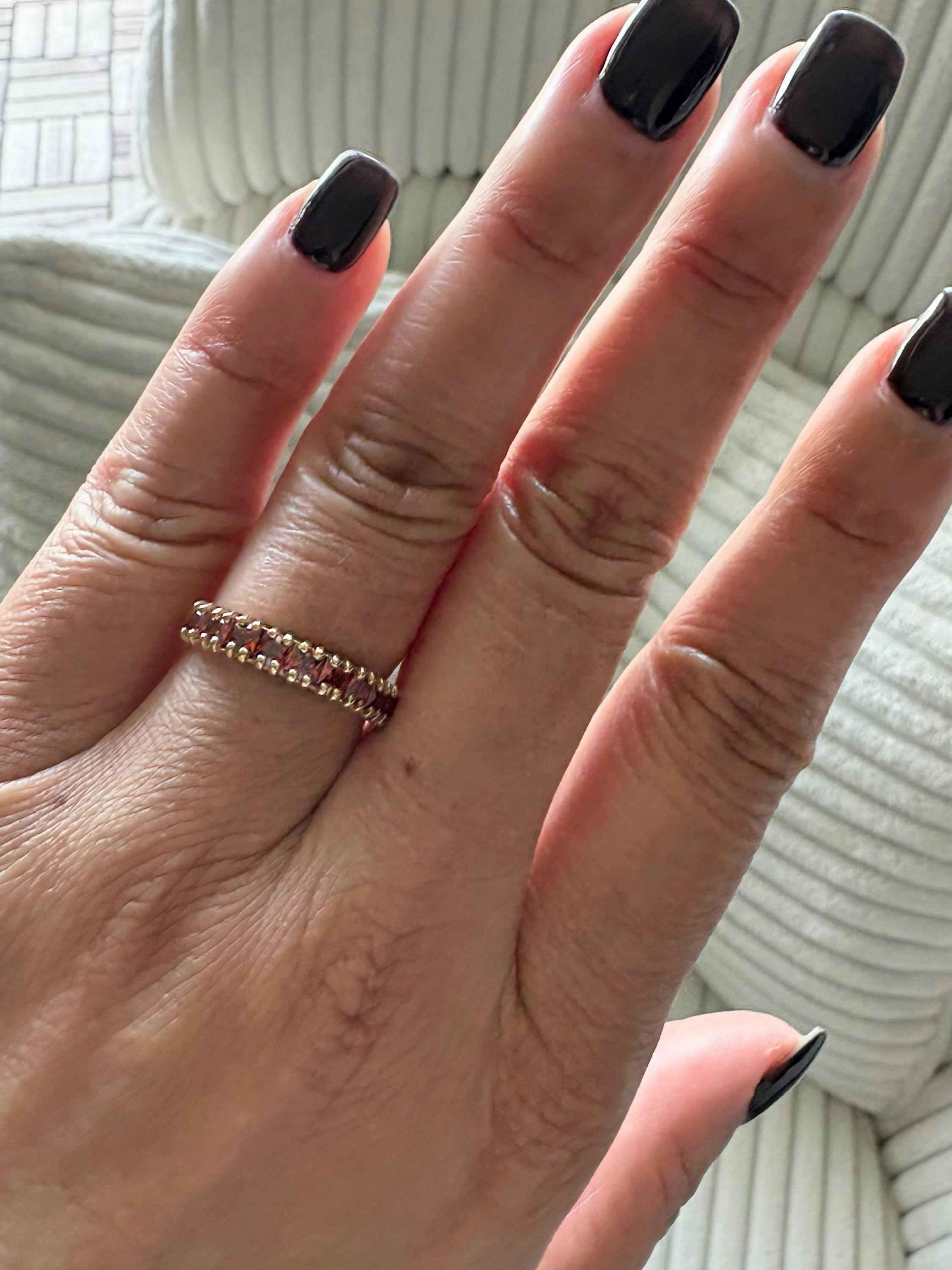 Bold geometry meets timeless charm in this January birthstone stacking ring. Featuring nine striking square-cut red garnet stones, the half eternity design symbolizes enduring love and strength. The rich, fiery hues of garnet make this piece a standout in any ring stack or a sleek statement when worn alone. A meaningful and modern addition to any jewelry collection - perfect for celebrating a birthday, milestone, or personal style.