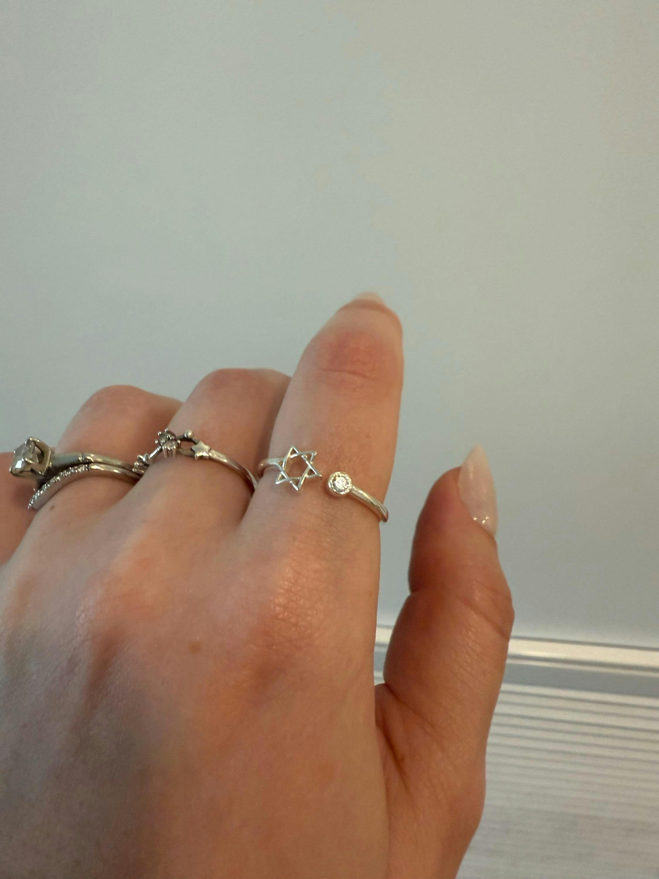 Elevate your spiritual style with our Star of David Ring featuring a small round clear quartz. This charming ring embodies the perfect blend of timeless symbolism and modern elegance. At its center, a dainty Star of David, a revered symbol of Jewish identity and faith, shines with subtle brilliance. Encircled by a delicate setting, a small round clear quartz stone adds a touch of celestial charm, enhancing the ring's ethereal allure. Crafted with versatility in mind, the adjustable design ensures a comfortable fit for any finger, making it an ideal accessory for daily wear or special occasions. Whether worn as a symbol of faith, protection, or simply as a stylish statement piece, this ring exudes understated sophistication and spiritual grace. Embrace the harmonious fusion of tradition and contemporary style with our adjustable Star of David Ring with clear quartz, and let it become a cherished symbol of your spiritual journey and personal expression.